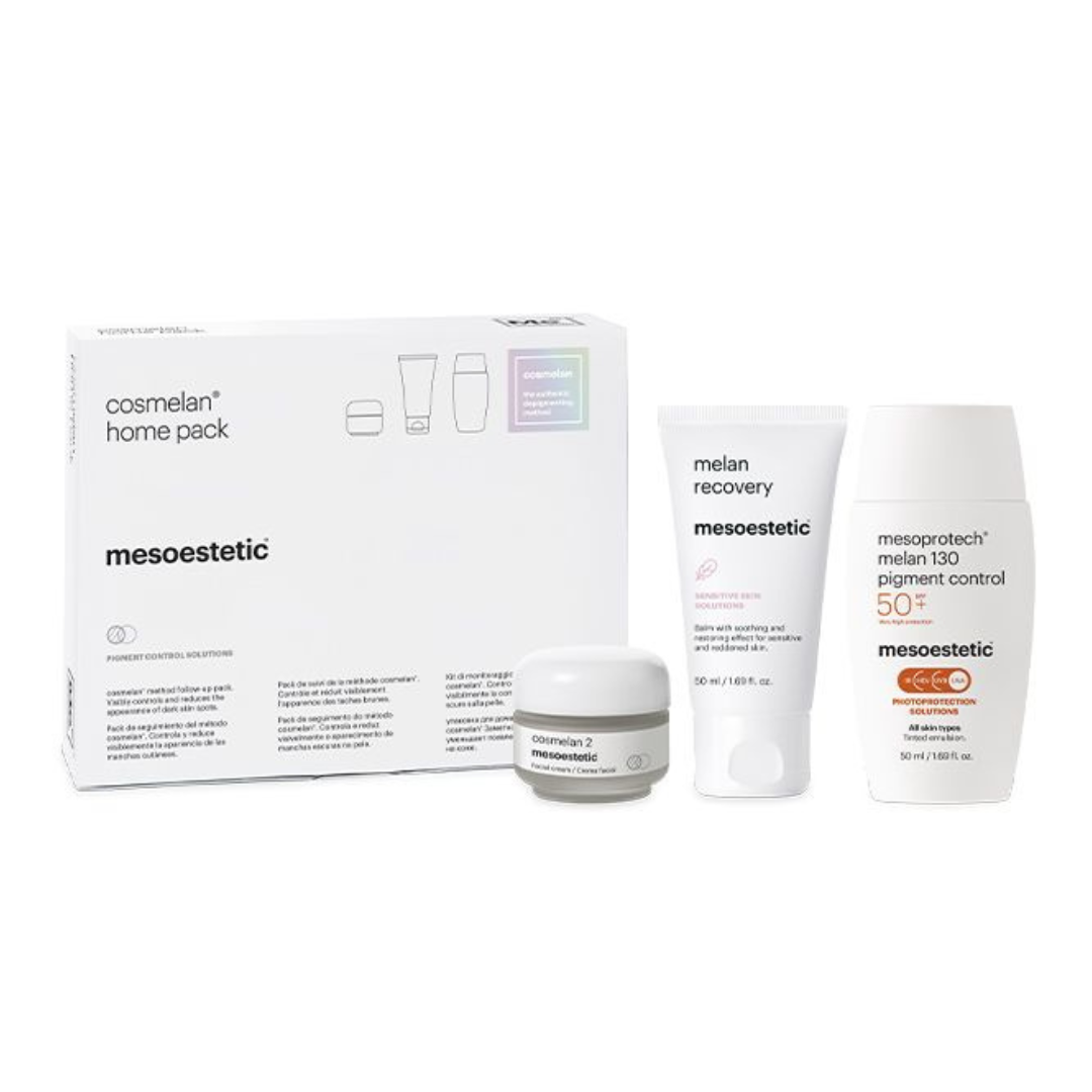 Mesoestetic Cosmelan Home Pack ist ein innovatives Set für die Heimpflege, das die professionelle Cosmelan-Depigmentierungsbehandlung ergänzt und fortsetzt. Die enthaltenen Produkte unterstützen die Reduktion von Pigmentflecken unterschiedlicher Herkunft, helfen den Hautton auszugleichen und tragen dazu bei, die Entstehung neuer Hyperpigmentierungen zu verhindern. Die Wirkstoffe wirken depigmentierend, regulieren die Melaninproduktion und unterstützen gleichzeitig die Hydratation und Regeneration der Haut.