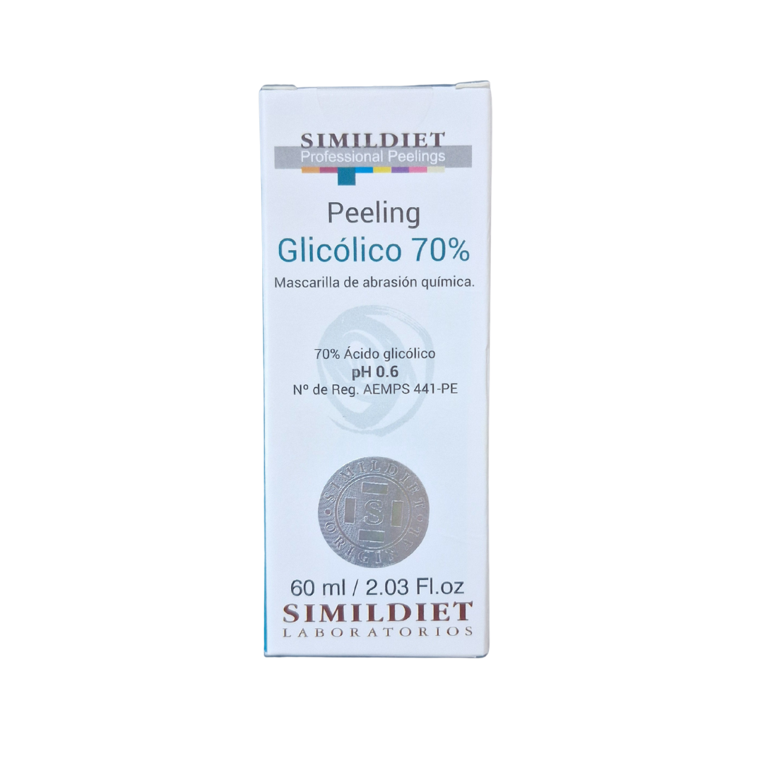 Peeling Glikolowy 70% marki Simildiet to zaawansowany preparat do profesjonalnej eksfoliacji, który dzięki wysokiemu stężeniu kwasu glikolowego (70%) oraz niskiemu pH (0,64) skutecznie penetruje warstwy skóry, inicjując intensywną regenerację i przebudowę tkanek. Peeling ten przeznaczony jest do wykonywania zabiegów powierzchniowo-środkowych, szczególnie na skórze ciała – w terapii blizn, rozstępów, przebarwień i nierówności skóry. Może być także stosowany miejscowo na twarzy w określonych wskazaniach.